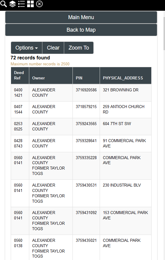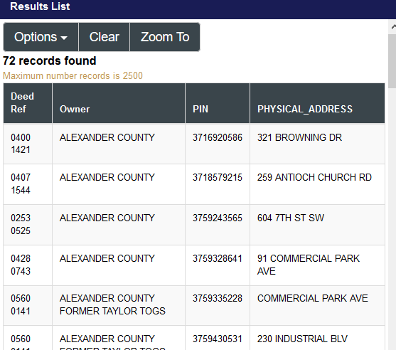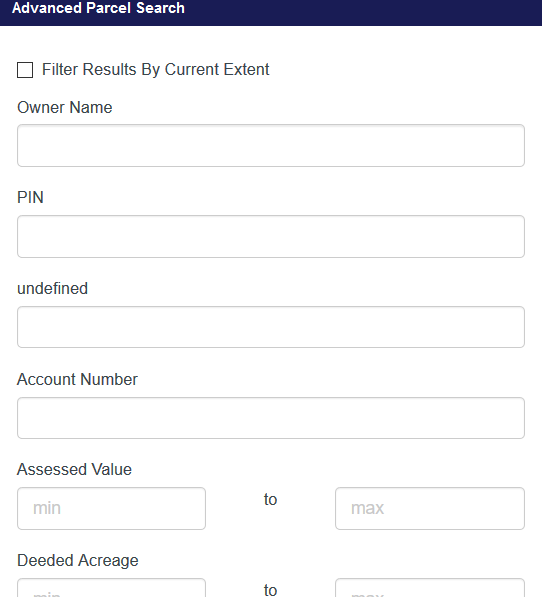 Default SearchThe Webviewer's primary focus is looking up parcel information, so the Advanced search panel is targeted to look for parcels using some of the other more common fields in our GIS System.