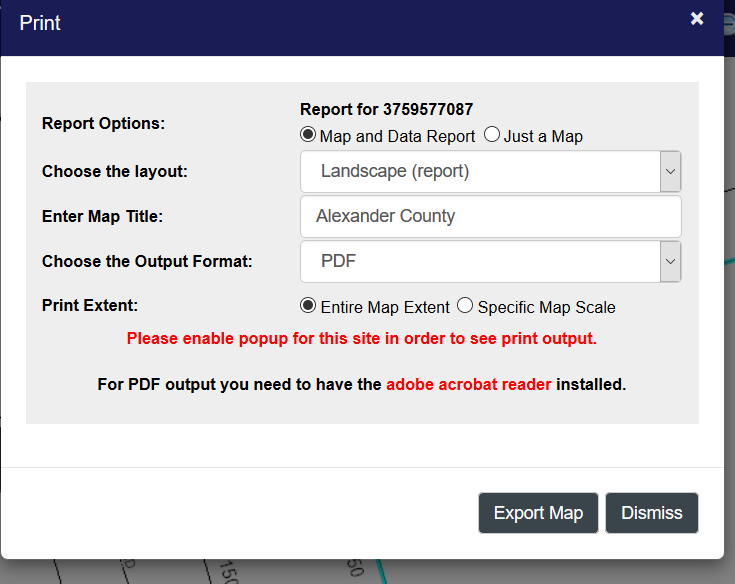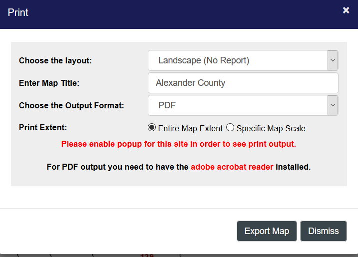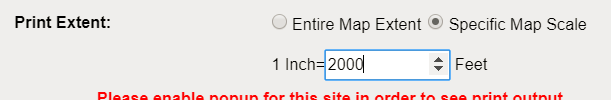 The Specific Map Scale option will keep the same scale of the map or will zoom to the scale that you type into the scale text box. Basically, this will zoom to the center of the browser window and scale the map to the scale that you desire. The resulting image may not show the exact same scene as you see in the browser window. For instance, parcels on the periphery of the browser window may show more or less of the parcel in the printed document. The scale is in one inch equals X format which means that one inch of the printed map represents X feet on the ground. In mapping Map Scale is often depicted in feet, meaning 1 foot on the ground equals X amount of feet on the ground. For instance, the USGS Topo maps are 1:24K scale meaning one foot on the map represents 24,000 feet on the ground.