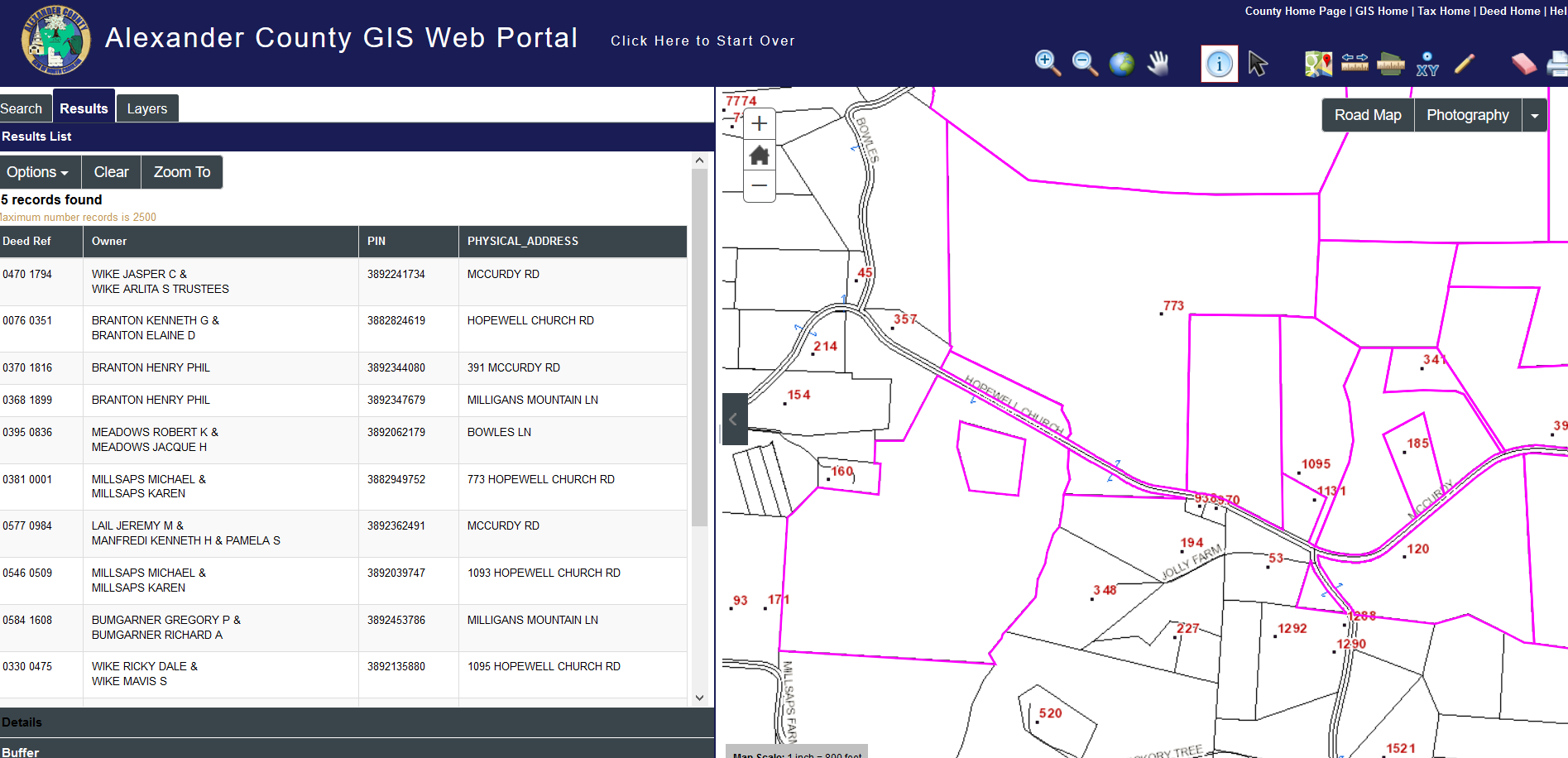 The search Search By Address (Geo Locator Method) uses an Address Locator web service to search for an address. The Address Locator is made using a Composite Address Locator which will first search on our Address Point layer and then search on our centerline layer. The Address Point result will correspond with the location of the Address Point in the GIS System, normally the center point of the primary structure that is being addressed. The centerline address point is an interpolated address from the beginning of the centerline within which the address point would correspond. This type of address point is generally less accurate than the one based on the address point, but is useful for addresses that have not been formally addressed in the system. Any Address Locator based search will correct for variations in the way road prefixes and suffixes are entered. For instance, the address point may be Whatever St officially in the addressing system, but if you type Whatever Street it will find it anyway.