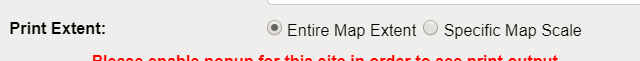 The Extire Map Extent option means that the image will show take the current view of the map in your browser and attempt to show that entire scene in the printed document. In doing so, however, it will alter the scale of the map either zooming out a little or zooming in a little depending on the orientation and size of your browser window when you attempted to print.