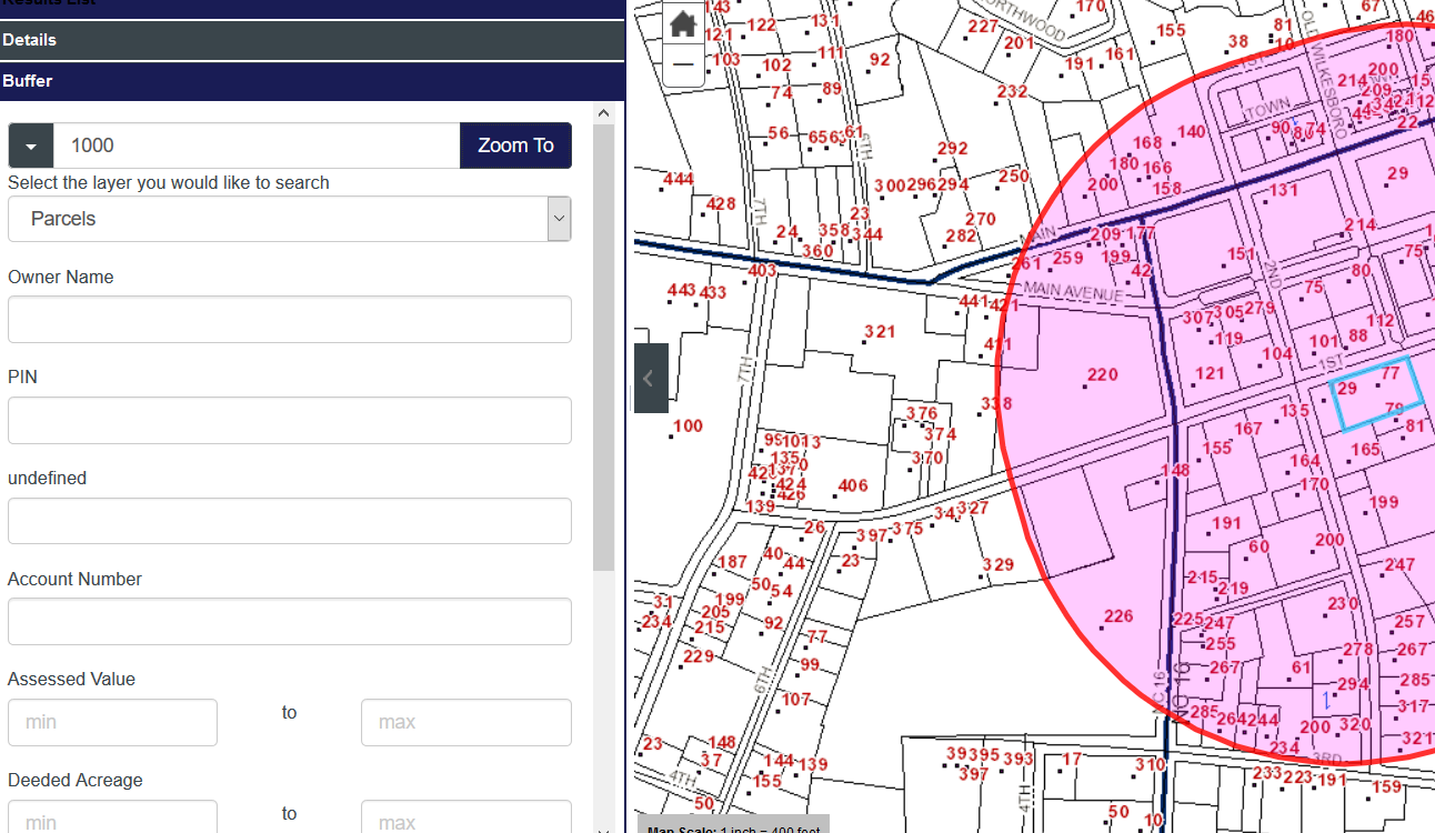 When you identify a parcel, if you click the "Tools" button at the buttom of the Detail panel, the application displays a list of tools that are available for this parcel. One of the tools is named "Select by Location". This tool allows users to buffer a parcel by a distance and query features based on a query.